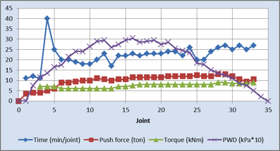Drill push force and torque during drilling were low, of the order of 100-130 kN and 6-8 kNm respectively. Also in the pull back phase the applied pull force was moderate, not exceeding 60 kN.