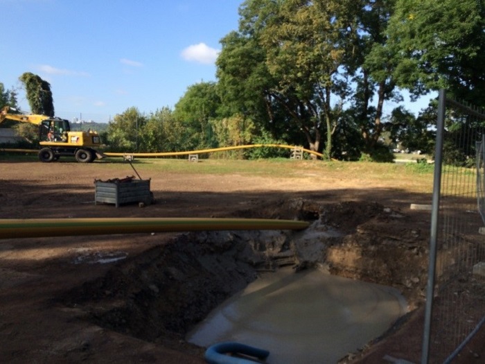 Die Arbeiten für die Dükerbohrung in Pfaffendorf begannen bereits Mitte August mit dem Einrichten des Bohrplatzes am linken Rheinufer unweit des Koblenzer Weindorfes. Anschließend wurde auch dort ein Stahlschutzrohr zur Stabilisierung der Kiesschichten eingebracht. Anders als in Oberwerth wurde in Pfaffendorf ein DN 600 Stahlschutzrohr installiert, die Methode des Bohrpressverfahrens wurde jedoch beibehalten. Auch hier war der Einbau des Schutzrohrs zunächst wenig problematisch. Kurz vor dem Erreichen des Felshorizonts kam es dann allerdings im Uferbereich des Rheins zu einer massiven Setzung. Die entstandenen Schäden wurden schnell und unkompliziert vom Auftraggeber behoben und das Rohr bis zum Fels vorangetrieben. Die Zementation der Ortsbrust sollte in diesem Fall nach dem Aufbau der Bohrausrüstung mit Hilfe des HDD Bohrgerätes erfolgen.