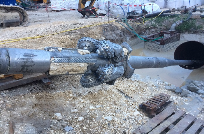 Dem folgte der Aufbau der HDD Bohrausrüstung und am 2. Juli 2016 wurde der Bohrbetrieb aufgenommen. Bald darauf wurde die erste Störzone angebohrt und, nicht ganz überraschend, stellten sich augenblicklich totale Spülungsverluste ein. Die Geschwindigkeit, mit der die Bohrspülung weglief, war allerdings für das Fachpersonal auf der Baustelle überraschend, sodass sich der Eindruck ergab, eine Vakuumblase angebohrt zu haben, die innerhalb weniger Sekunden mehr als 60 m³ Spülung schluckte. Der nächste Monat war geprägt von Zementationen, mit denen diese Stör- und Verlustzonen abgedichtet, bzw. verfüllt wurden. Dabei wurde auf Zementationstechnik aus dem Ölfeld zurückgegriffen. Zusätzlich wurden neuartige Zementrezepturen auf der Baustelle entwickelt, die ein immer effizienteres Vorgehen beim Dichtsetzen ermöglichten. Gleichzeitig wurde die Pilotbohrung vorangetrieben. Die Häufigkeit der Zementationen bestätigte negative Prognosen der Baugrunduntersuchungen, dass trotz des Verpumpens großer Volumina an Dicht- und Füllmaterial, extrem hohe Durchlässigkeiten bzw. große Kluftweiten im Baugrund angetroffen wurden, die wahrscheinlich in Verbindung mit fließendem Grundwasser zu einem schnellen Abtransport des Dicht- und Füllmaterials führten. Da diese Häufigkeit der Zementationen für alle Beteiligten überraschend war und diese eine unerwünschte Verzögerung der Bauzeit nach sich zogen, begannen nach 2 Wochen erste Überlegungen, wie man die beiden Bohrungen in der vorgegeben Zeit (vor Wintereinbruch) fertigstellen könnte. Ende Juli waren 38 % der ersten Pilotbohrung fertig, dazu wurden aber bereits 115 % der dafür zur Verfügung stehenden Bauzeit genutzt. Guter Rat war teuer, Überlegungen gingen ergebnisoffen in alle Richtungen. Der Bauherr und die Baufirmen standen mit dem Rücken zur Wand, da die vorstehende Bauzeitenanalyse und eine entsprechende Extrapolation des Zeitstrahls deutlich zeigten, dass, wenn überhaupt, nur die erste Bohrung bis Weihnachten 2016 fertig gestellt werden würde. Das hätte dann die Kofinanzierung durch die EU zumindest in Frage gestellt.